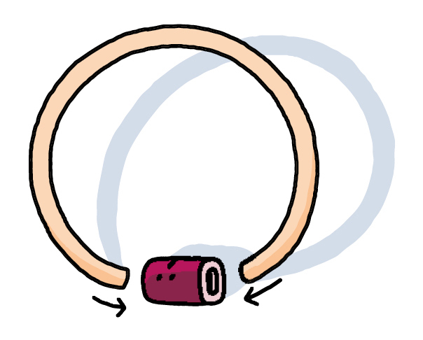 1.Trempe ta baguette dans l’eau une nuit, puis plie-la en cercle. Insère chaque extrémité dans le sureau évidé, en guise de fermoir. Consolide-le avec du ruban adhésif si besoin est.