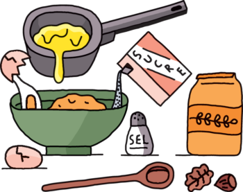 1- Ramollis le beurre à la casserole (mais ne pas le faire fondre complètement). Laisse refroidir le beurre, puis verse-le dans un saladier avec le sucre, le sel et les œufs. Mélange le tout.