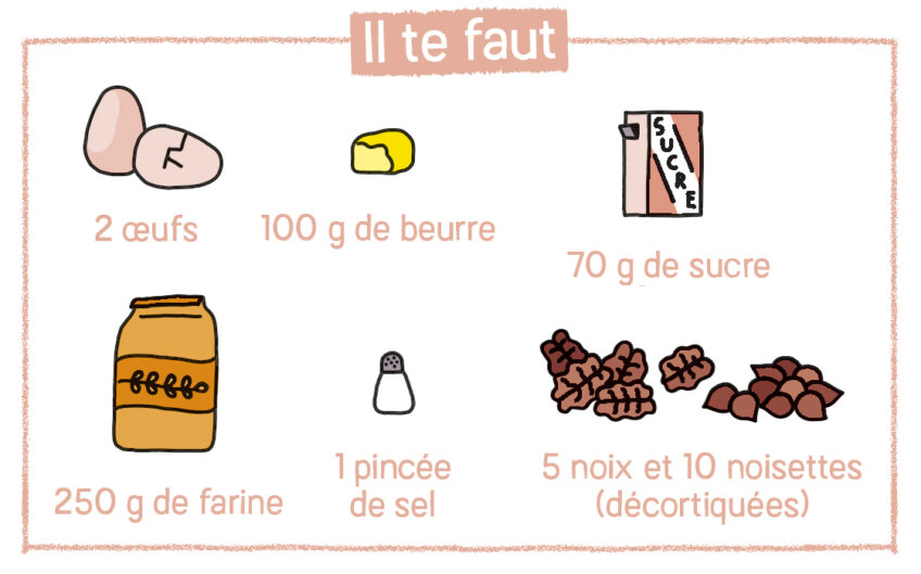 2- Ajoute la farine, remue et ta pâte est prête. Incorpores-y les noix et noisettes brisées.