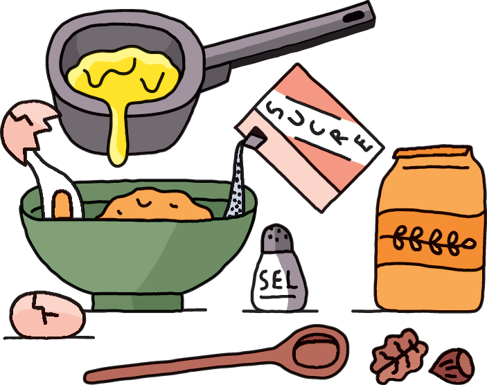 1- Ramollis le beurre à la casserole (mais ne pas le faire fondre complètement). Laisse refroidir le beurre, puis verse-le dans un saladier avec le sucre, le sel et les œufs. Mélange le tout.