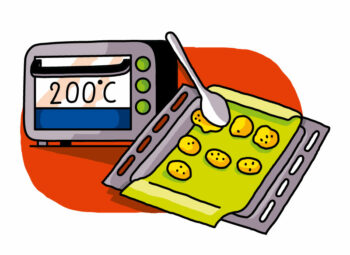 Étape 3 : Préchauffe le four à 200 °C (th. 6 ou 7). Mets le papier sulfurisé sur ta plaque de cuisson. Déposes-y des boulettes de pâte à l’aide d’une cuillère à soupe. Aplatis-les.