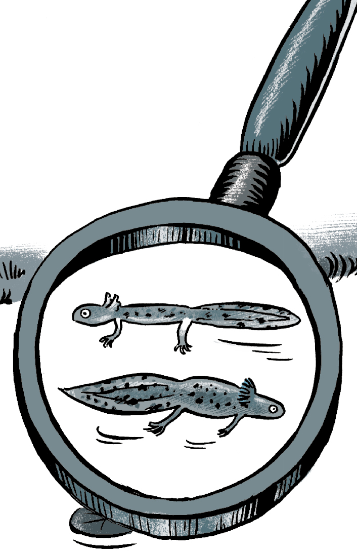 Salamandre et triton : Un têtard à 4 pattes avec des branchies derrière la tête ? Pas de doute, c’est une larve d’urodèle, c’est-à-dire de triton ou de salamandre. Celle de la salamandre tachetée possède des taches claires en haut des pattes. Les larves de triton n’en ont pas ! Mais pas de larve aquatique pour la salamandre noire : ses petits naissent directement sur la terre ferme.