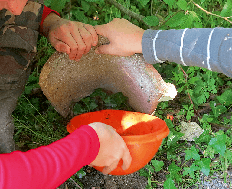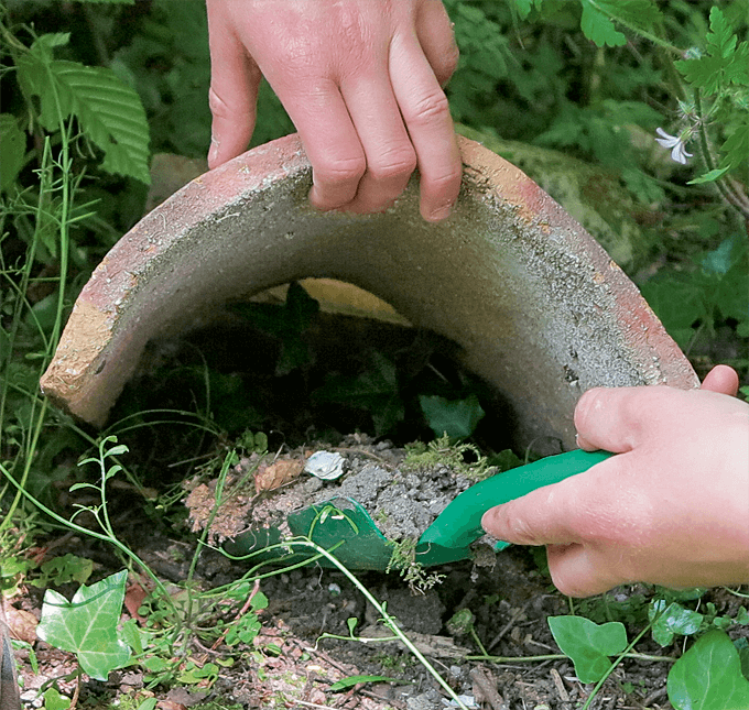 2 | Bouchez le fond, puis avec votre pelle, glissez à l’intérieur de la terre avec quelques feuilles et brindilles.
