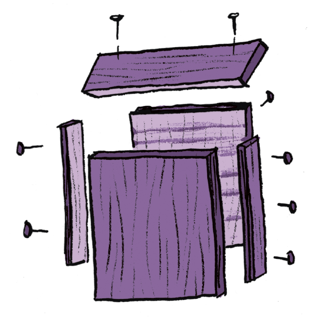 2.Assemble le tout avec des clous pour former une petite boîte plate, accessible seulement par le dessous. Ne peins jamais l’intérieur.