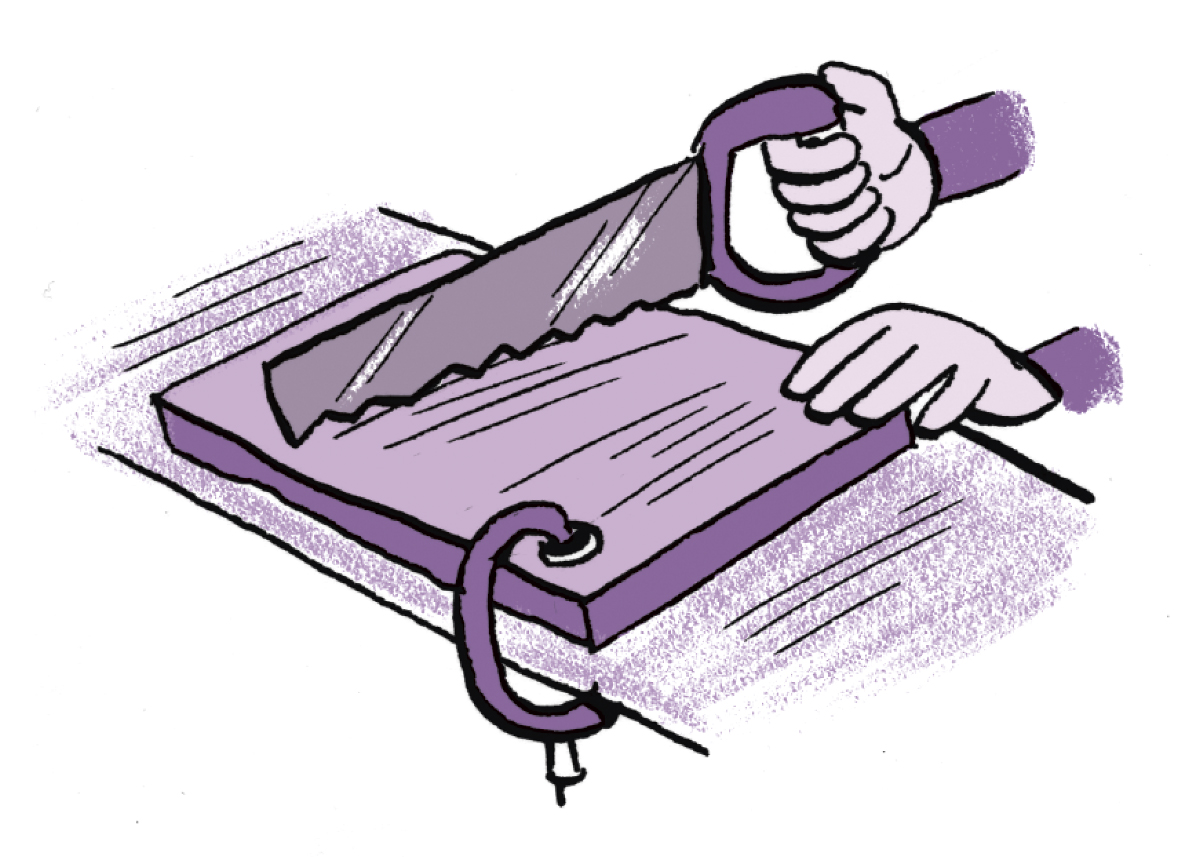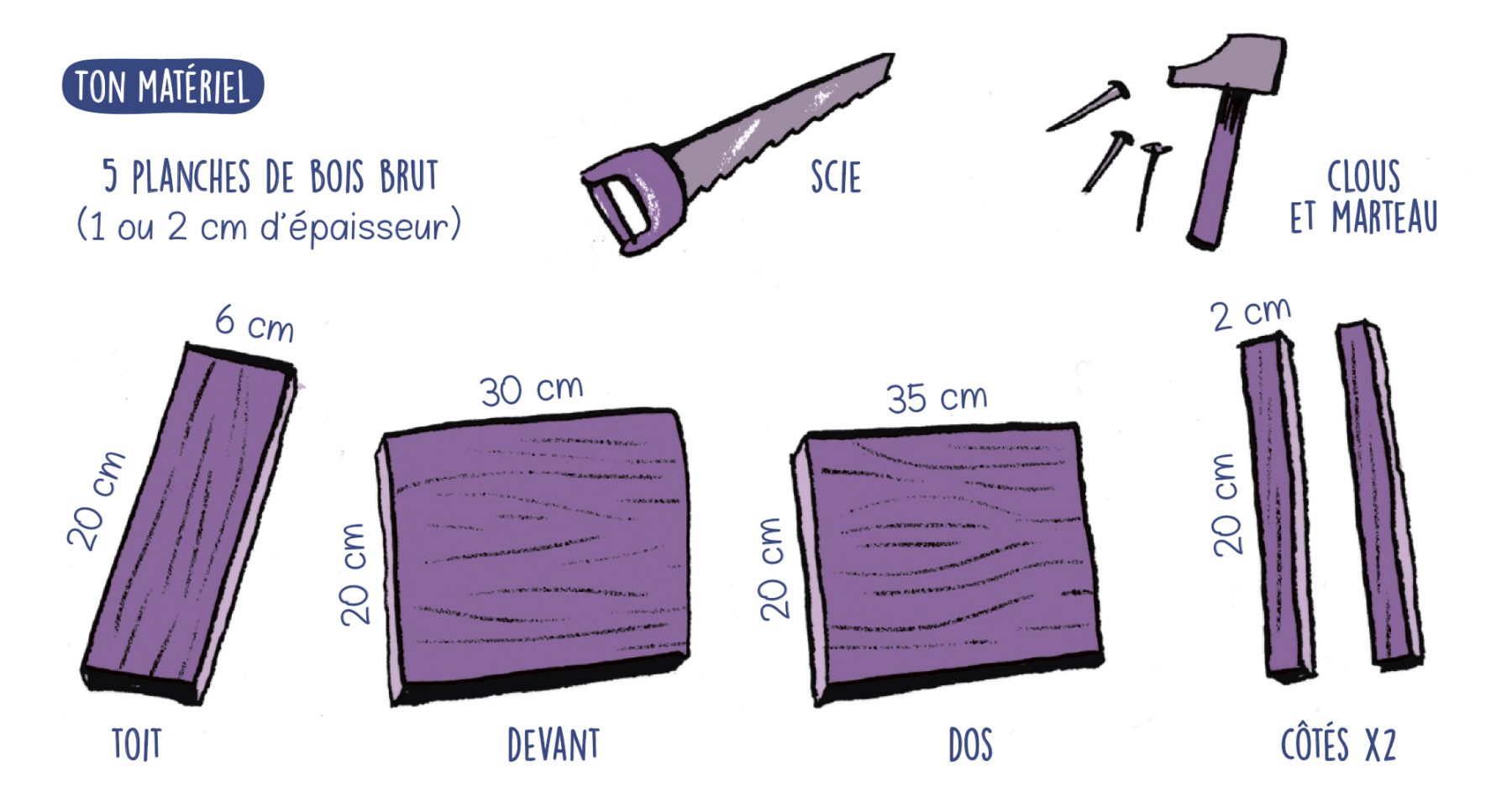 1.Prends tes 5 planches : le toit, le devant, le dos et les deux côtés. Creuse à la scie des rainures sur les parties intérieures. Elles permettront aux chauves-souris de bien s’y agripper.