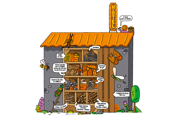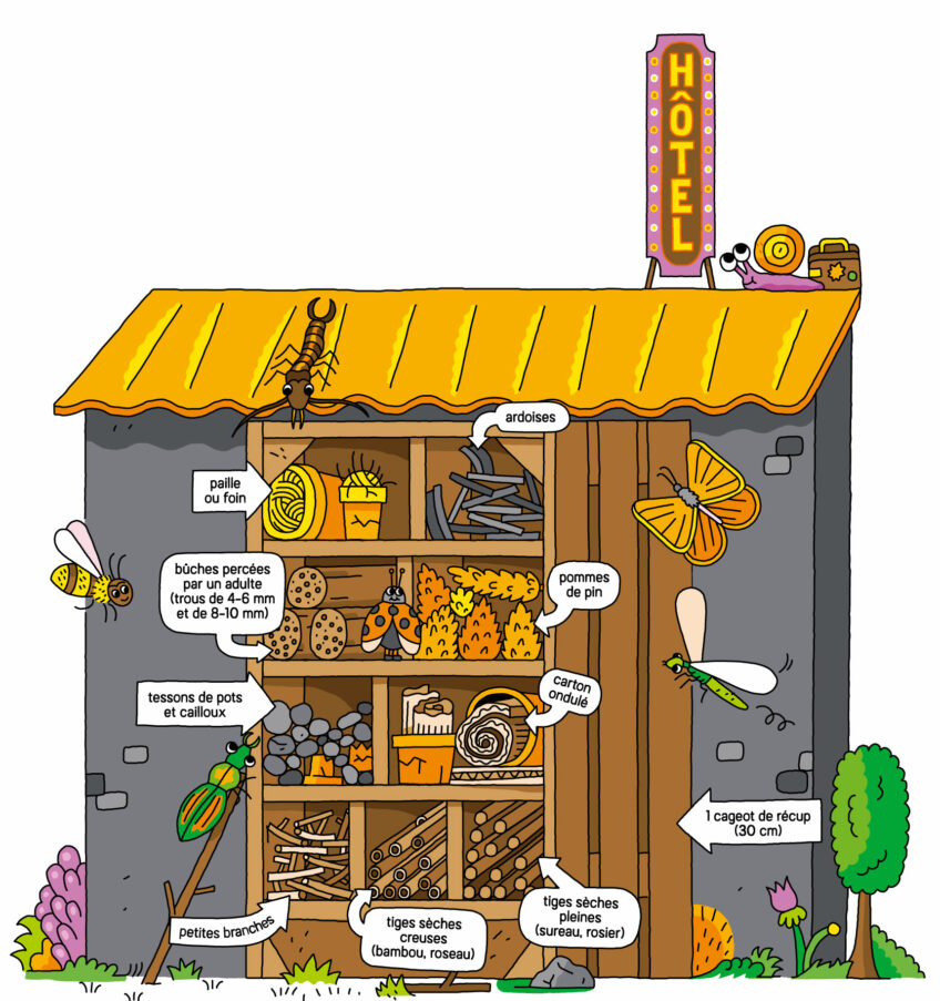 Offre un abri sur mesure aux insectes pollinisateurs. Adosse-le à un mur, à l’abri de la pluie. Tu pourras inviter et observer tous ces copains du jardin : abeilles, coccinelles, papillons…