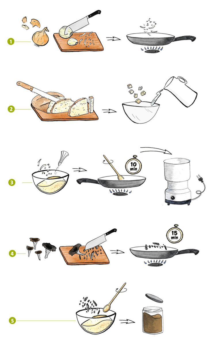 - Mélangez pain, ail et oignon, ajoutez les aromates et faites cuire 10-15 min en remuant régulièrement, puis mixez le mélange.