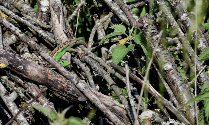 Les violentes bourrasques ont fini par avoir raison du vieux pommier, brisant son tronc vermoulu. Ses branches sèches se retrouvent éparpillées au sol, mais pas question de les apporter à la déchetterie, et encore moins de les brûler ! Même mort, cet arbre est un havre de vie. Un lézard agile a déjà adopté les rameaux tombés pour ses bains de soleil.