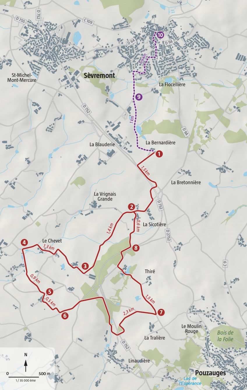 (1) Départ depuis la Maison de la vie rurale, siège du CPIE Sèvre et Bocage et lieu de visite des jardins (2) A l’entrée de La Sicotière, laisser le hameau sur la gauche et continuer. (3) Prendre vers Le Pas français et Le Chevet (4) Contourner les étangs en direction du Moulin Croué. (5) Traverser La Blinière en direction du sud-est. (6) Prendre le GR de Pays de Pouzauges à gauche et le suivre jusqu’à La Tralière. (7) Quitter le GR vers le nord-ouest en direction du château des Echardières. (8) Traverser la D752 en direction de La Sicotière en longeant la lisière est du bois.
