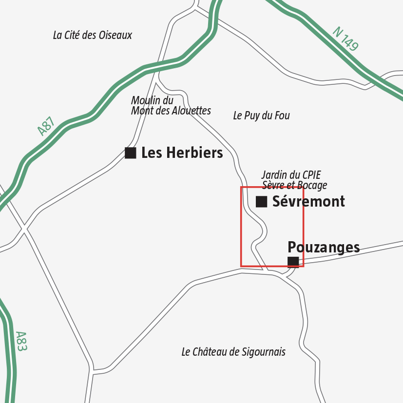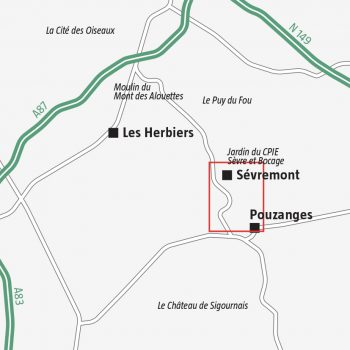 (1) Départ depuis la Maison de la vie rurale, siège du CPIE Sèvre et Bocage et lieu de visite des jardins (2) A l’entrée de La Sicotière, laisser le hameau sur la gauche et continuer. (3) Prendre vers Le Pas français et Le Chevet (4) Contourner les étangs en direction du Moulin Croué. (5) Traverser La Blinière en direction du sud-est. (6) Prendre le GR de Pays de Pouzauges à gauche et le suivre jusqu’à La Tralière. (7) Quitter le GR vers le nord-ouest en direction du château des Echardières. (8) Traverser la D752 en direction de La Sicotière en longeant la lisière est du bois.