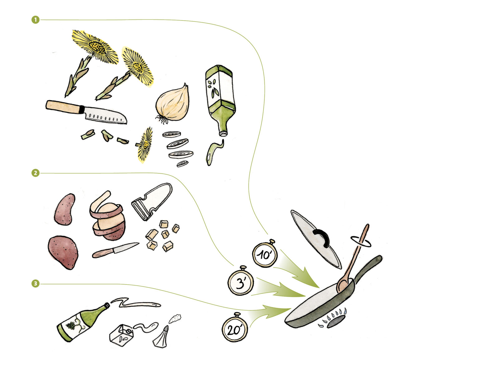 - Emincez grossièrement les tussilages et les oignons puis faites-les revenir à la poêle dans un peu d’huile pendant dix minutes.
