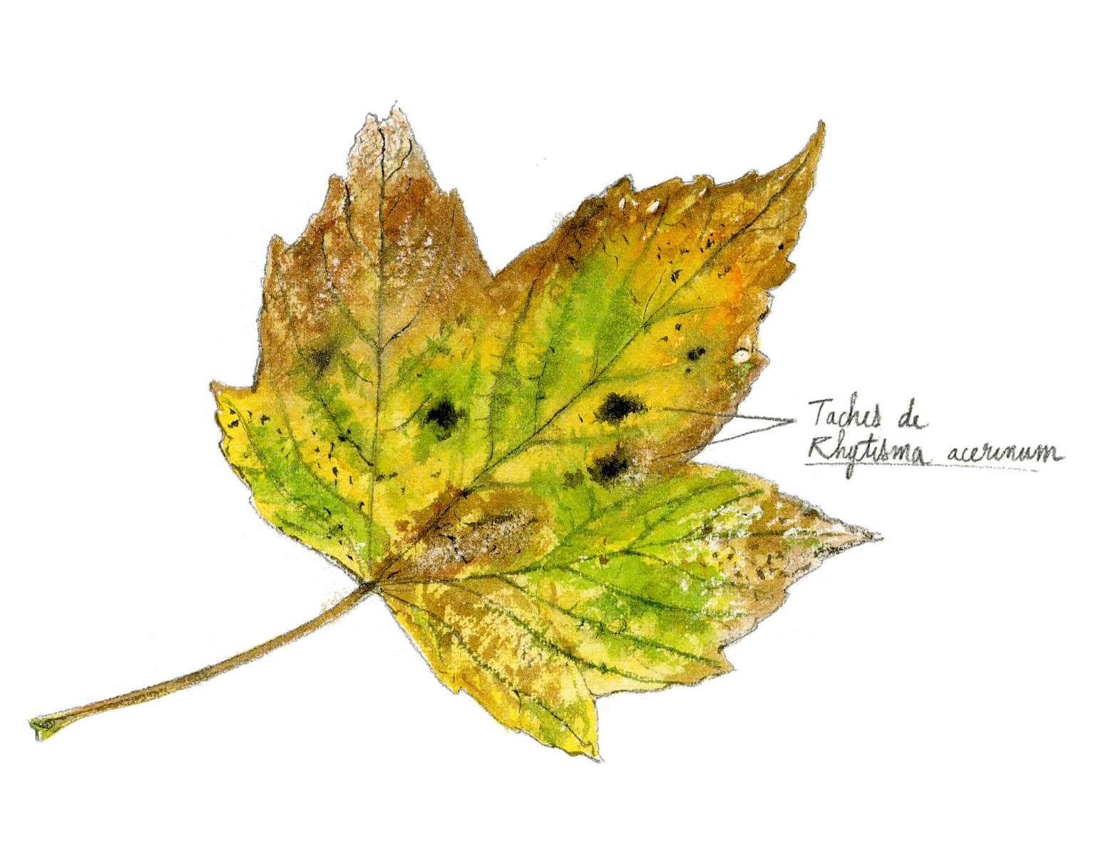 Les feuilles jaunies ou orangées par l'automne sont souvent ornées de taches noires aux bords clairs. Leur auteur est le goudron de l'érable, un champignon parasite dont les spores attaquent les jeunes feuilles au printemps en provoquant la mort des tissus cellulaires. Avec la chute des feuilles, Rhytisma acerinum retourne au sol, où il fructifiera l'année suivante pour infecter à nouveau les érables. Selon l'importance de la maladie, l'érable peut être affaibli, mais il ne meurt pas.