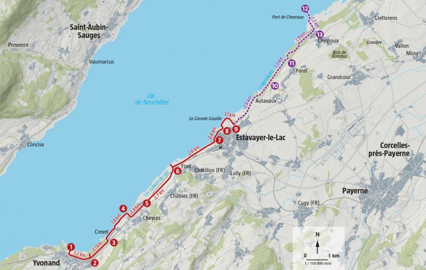 (10) Suivre le chemin des Fours jusqu’à la plage de Forel. (11) Tourner à gauche et passer par le bord du lac. (12) Se rendre au port de Chevroux ou bifurquer deux fois à droite pour rejoindre (13) l’arrêt de bus.