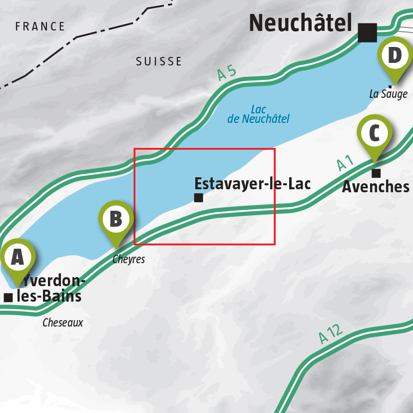 Circuit ornithologique : (1) Depuis la gare d’Yvonand, suivre le balisage jaune le long du chemin des Colons. (2) Jeter un œil à la plage de la Petite Amérique, puis revenir sur ses pas. (3) Suivre le balisage jaune sur la gauche. (4) Au port de Cheyres, continuer à droite, puis à gauche sous la gare. (5) Traverser la voie CFF et aller à gauche. (6) Accéder à un petit observatoire au bord d’un étang. (7) Prendre à gauche avant le ruisseau et emprunter le pont qui le traverse. (8) Suivre le chemin des Loquettes. (9) Rejoindre la gare d’Estavayer-le-Lac à vingt minutes.