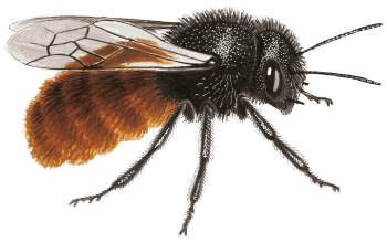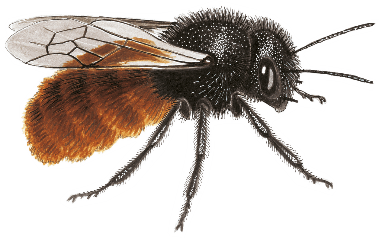 L'osmie cornue Visible seulement jusqu'au mois de mai, cette abeille à l'abdomen roux butine de tout : violettes, bruyère, renoncules ou scilles… rien ne l'arrête ! On l'observe souvent le long des bâtiments, à la recherche d'un trou pour y déposer ses œufs. Si vous installez un nichoir, elle viendra sûrement vous rendre visite.