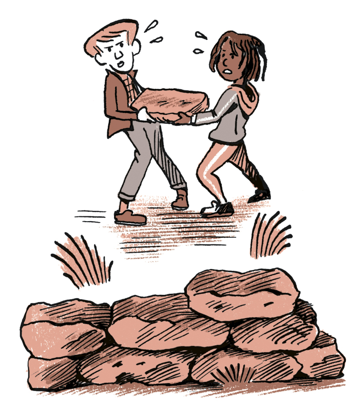 Pose d’abord les plus grosses pierres plates : c’est la base de ton mur. Mets-les bien à plat. Appelle tes copains, c’est lourd. Attention les doigts !