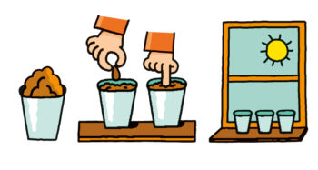 1- Remplis tes pots de terreau. Sèmes-y une graine en l’enfonçant de 1 cm avec ton doigt. Place tes semis à l’abri sur le rebord intérieur d’une fenêtre. Patiente 3 semaines…
