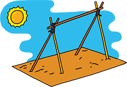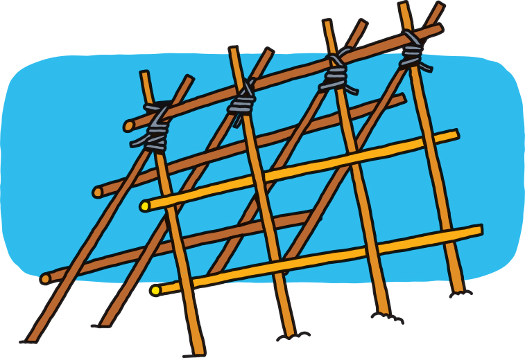 2 - Plante les 4 perches épaisses en les nouant 2 par 2. Attache une perche transversale par-dessus.