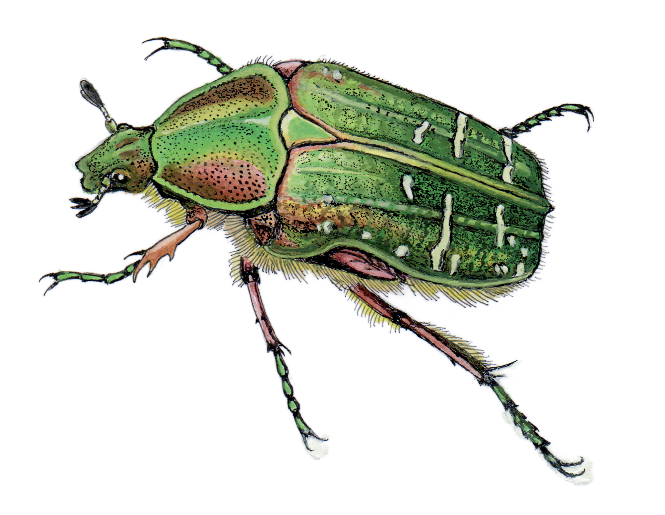 Véritables pistes d’atterrissage miniatures, les fleurs de sureau accueillent abeilles et syrphes bien sûr, mais aussi des coléoptères de toutes les tailles dès le mois de mai. L’imposante cétoine dorée, petit bijou de scarabée, est la plus visible quand elle broute les ombelles.