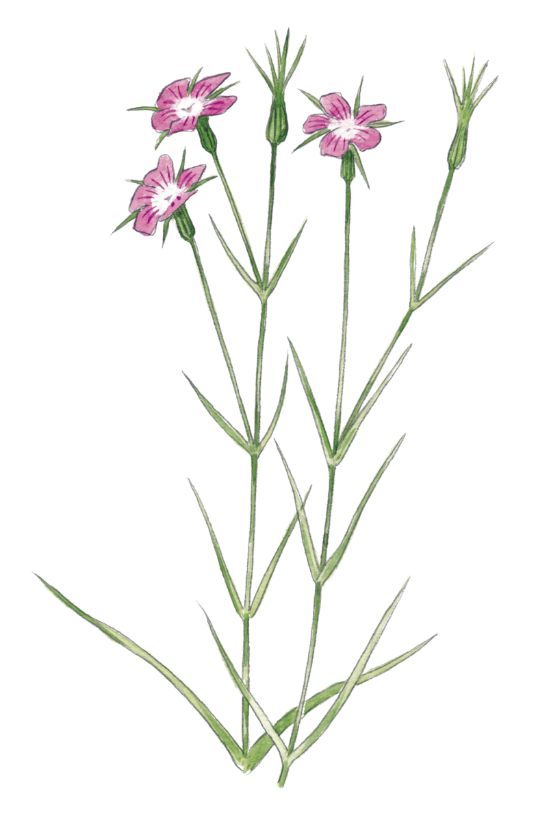 Cette grande annuelle de la famille des œillets poussait autrefois en abondance dans les champs de blé du sud de l’Europe. Aujourd’hui, elle est en voie de disparition, n’étant pas parvenue comme le coquelicot à s’adapter aux terrains modernes… Attention, ses graines sont toxiques.