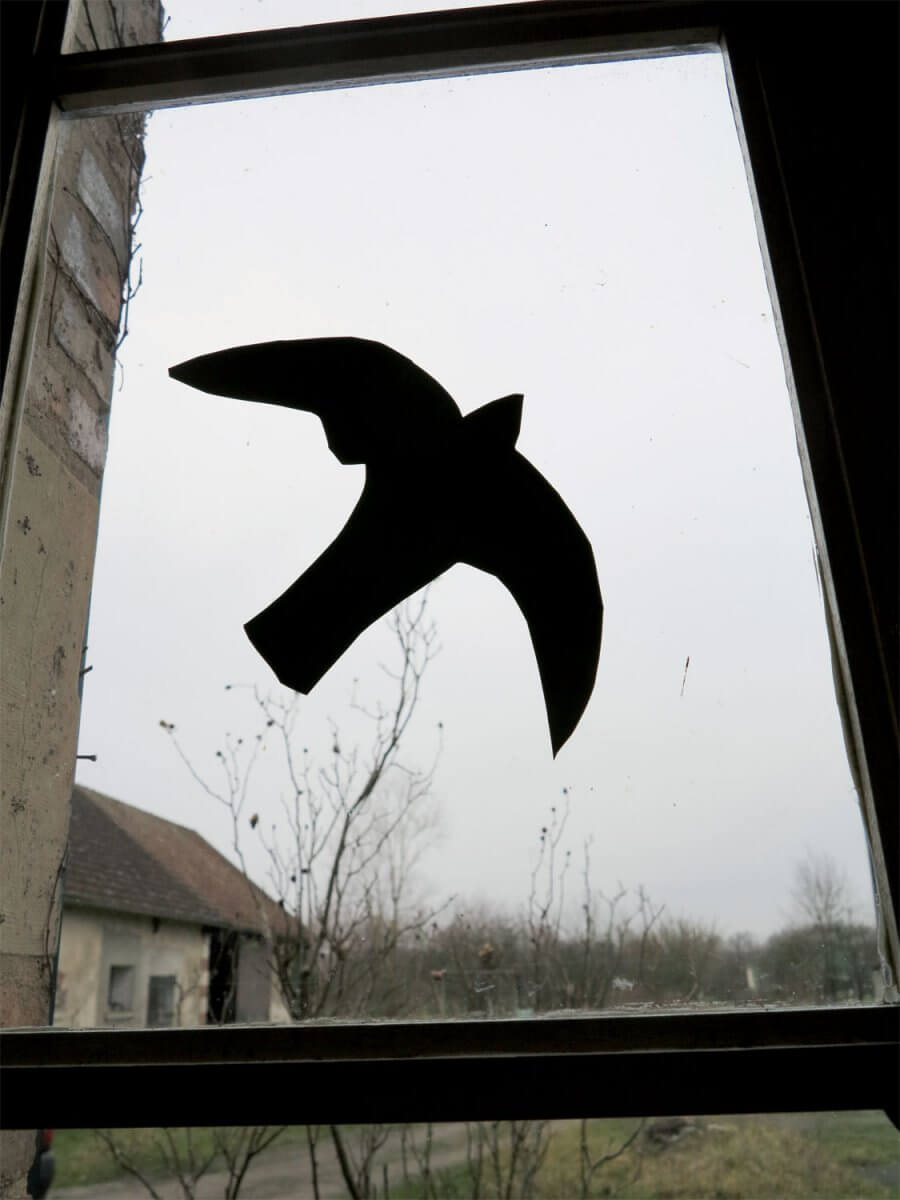Des millions d’oiseaux se tuent chaque année en heurtant les vitres. Effarouchez-les en plaçant une silhouette de rapace sur votre fenêtre ou votre baie vitrée. La simple vue de cette forme les effraie et peut ainsi leur sauver la vie.