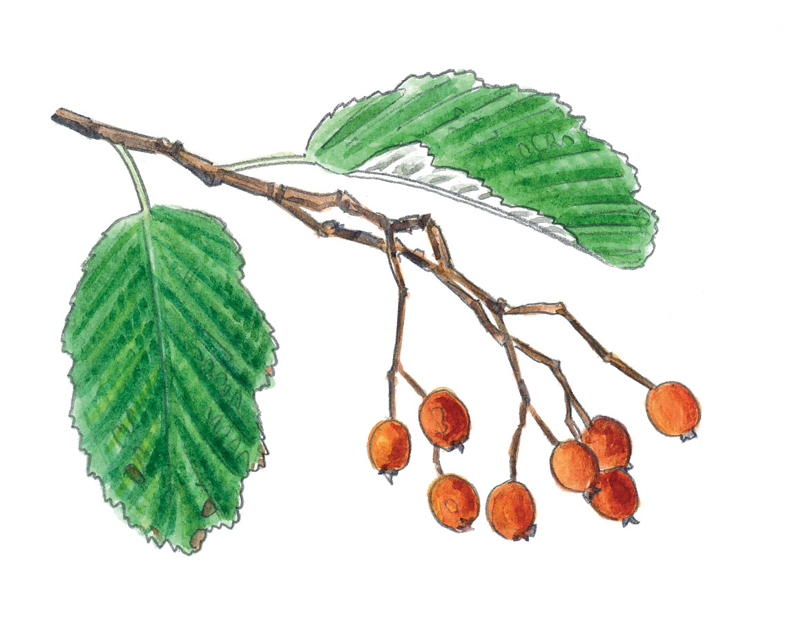 - Particularités : attire les oiseaux, bonne résistance au froid, au vent et à la sécheresse. Bois dur pour la fabrication d’outils, teinture, bois de chauffe, fruits comestibles en confitures, feuillage esthétique