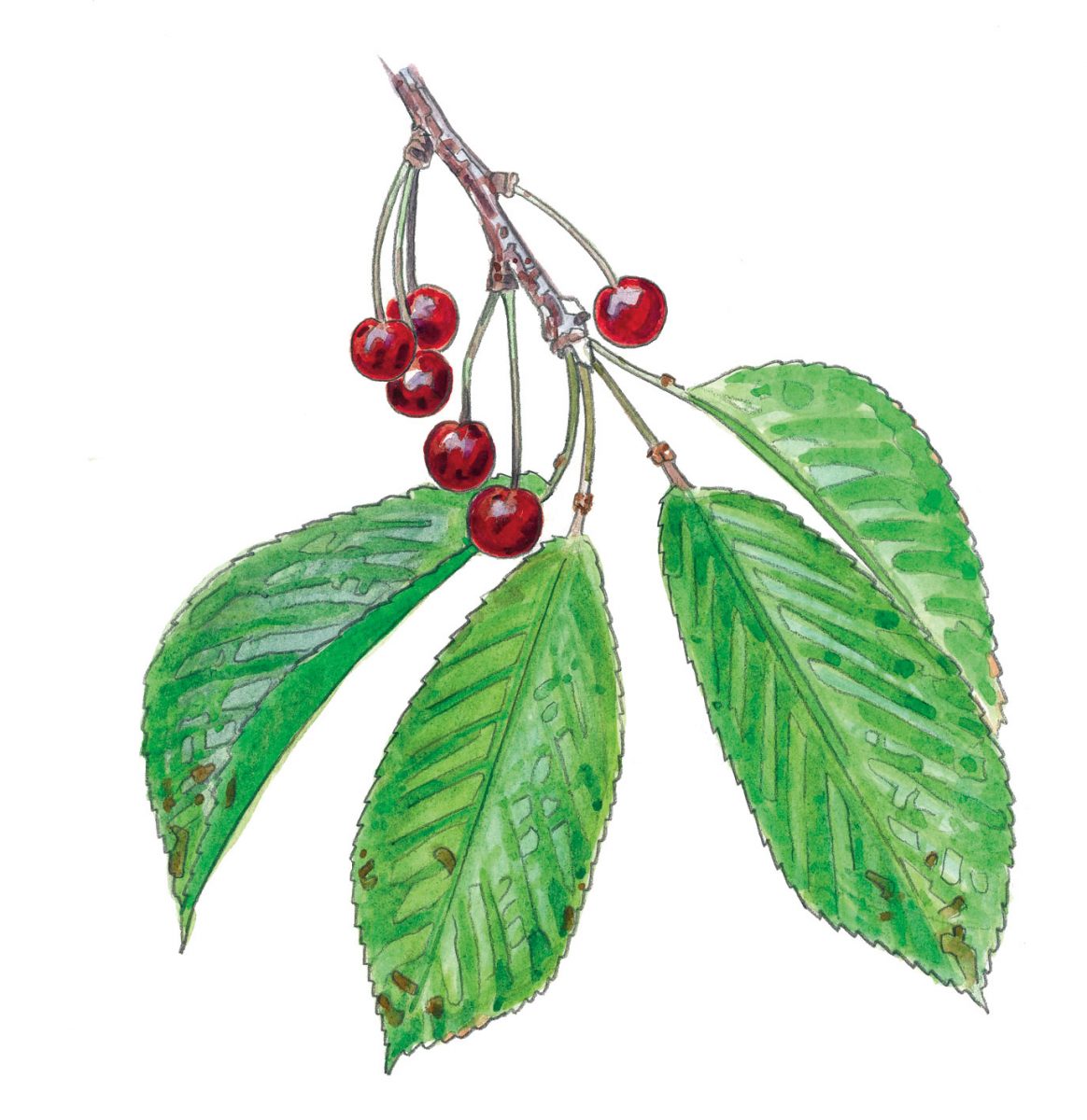 - Particularités : mellifère, attire les oiseaux, nombreuses variétés domestiques locales (cerisiers) aux fruits excellents pour les desserts et les sirops ou simplement à savourer cru, bois d’œuvre