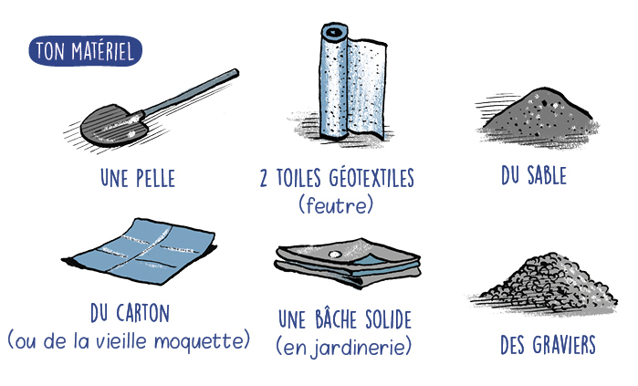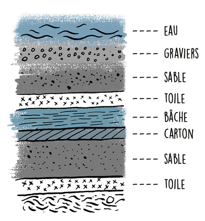 3.Étale le premier géotextile. Verse dessus une couche de 5 cm de sable, puis étale du carton.