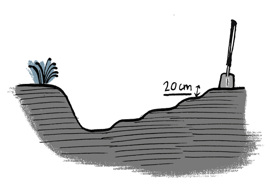 2.Creuse en escaliers, par paliers de 20 cm, un peu plus que la profondeur prévue (+ 10 cm). L’idéal est une mare profonde de 80 cm.