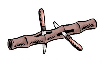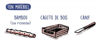 3- Prends une tige bien droite de bambou ou de roseau pour l’axe du moulin. Fends le milieu de cet axe avec ton canif. Puis crée, à côté, une seconde fente perpendiculaire à la première. Attention les doigts ! Demande l'aide d'un adulte !