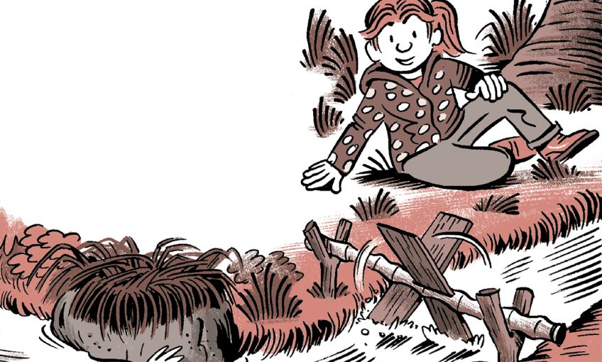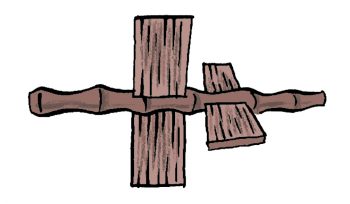 6- Plante les deux fourches dans la terre de part et d’autre du petit ruisseau, de sorte que les pales du moulin plongent leur extrémité dans le courant. Pose ton axe et… ça tourne !