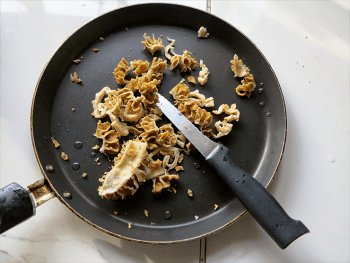 1 | Après les avoir lavées pour nettoyer les alvéoles, coupez les morilles en morceaux et mettez-les dans la poêle. Vous pouvez aussi les faire sécher sur un papier puis les conserver dans un bocal hermétique.