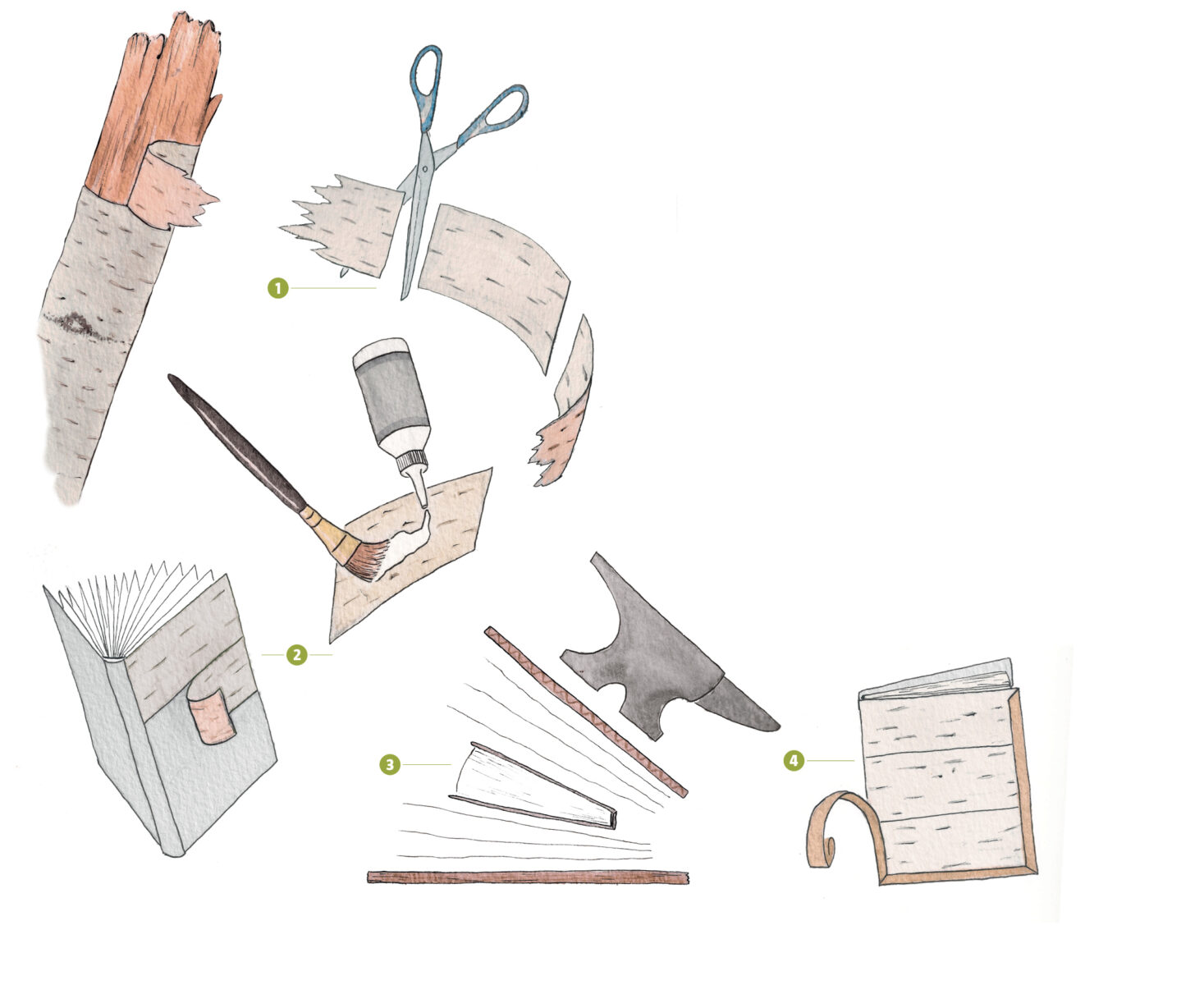 - Découpez des bandes d’écorce de bouleau aussi longues que la largeur du carnet, en nombre suffisant pour couvrir les deux faces.